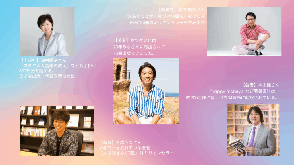 もう、信じられないくらい嬉しい企画をありがとうございます✨✨ ずっと密かに憧れていた『自分の本の出版』をこんな豪華な方々から教えていただけるなんて夢のようです! しっかり学ばせていただきますのでよろしくお願いいたします。